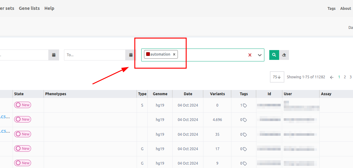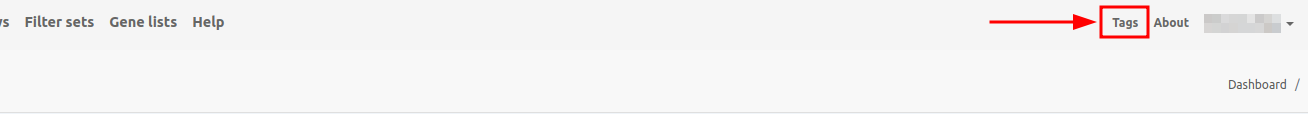 To filter samples using tags, click on the "Tags" box on the top of the page and select the tag that you want to use to filter your samples. Now, only samples containing the selected tag are displayed: