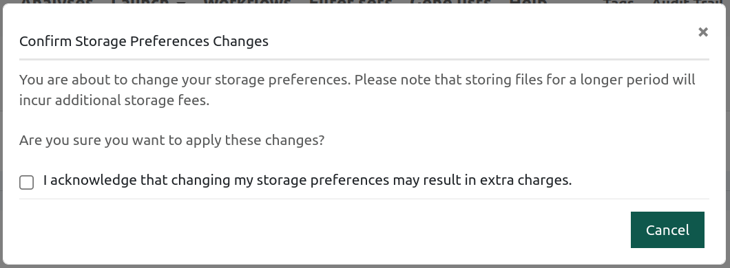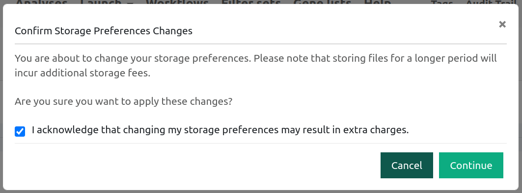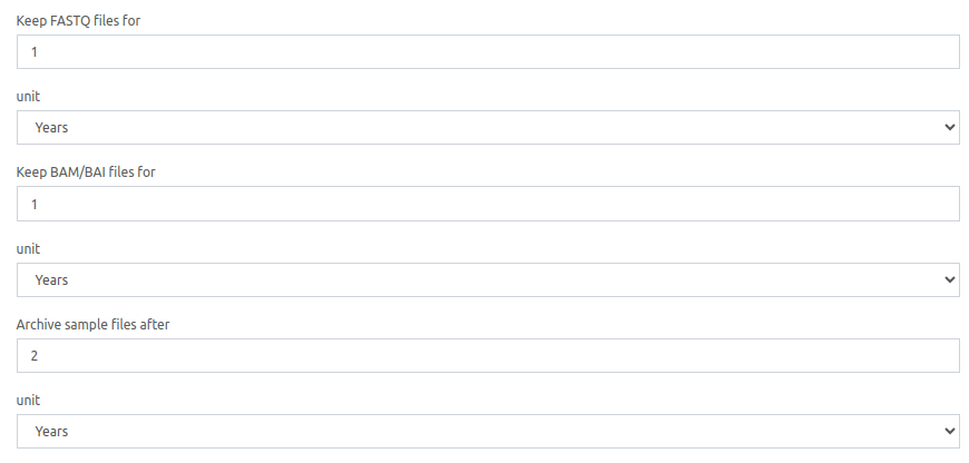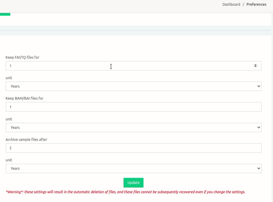 WARNING: Please, bear in mind that updating the storage preferences might lead to the imminent deletion of data. For example, if you select to keep FASTQ and BAM/BAI files for one year, all the FASTQ and BAM/BAI files of samples analyzed more than a year ago will be removed. If BAM/BAI files are deleted, certain functionality that depends on the presence of those files will not be available any more e.g. (JBROWSE/IGV) read alignments visualization.
