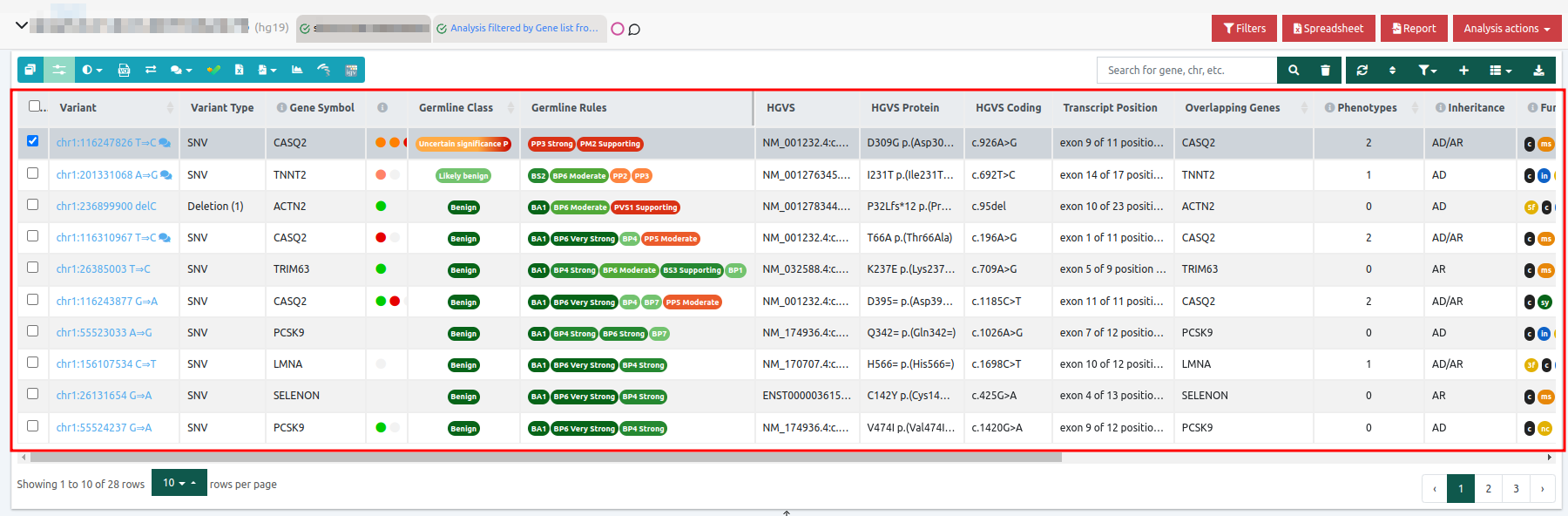In the following document when we mention results, we are referring to the analysis results table where users can view the classification/annotation of the variants on VarSome Clinical (see example below).