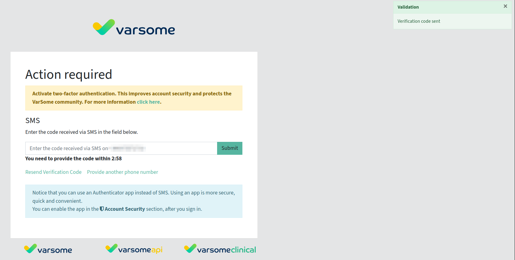 You will only need to enter the code received via SMS the first time you authenticate. After that, you will start receiving authentication code via email, although the system may still send some codes via SMS as well. If you do not receive the email or the SMS, please contact support team (support@varsome.com) for assistance.
