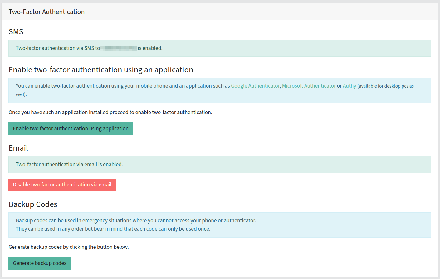The Two-Factor Authentication via backup codes will generate 3 backup codes that you can use to enter the platform. Those backup codes can be used only once and are meant for situations where the primary device (sms, email or application) is not available.