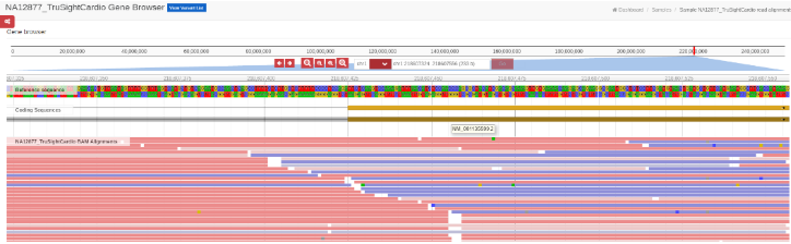Also, by clicking on one of the Exons, a new tab will open with a JBrowse (jbrowse.org) window showing the alignment details from the analysis’ bam files. JBrowse is a software tool installed on our secured servers.
