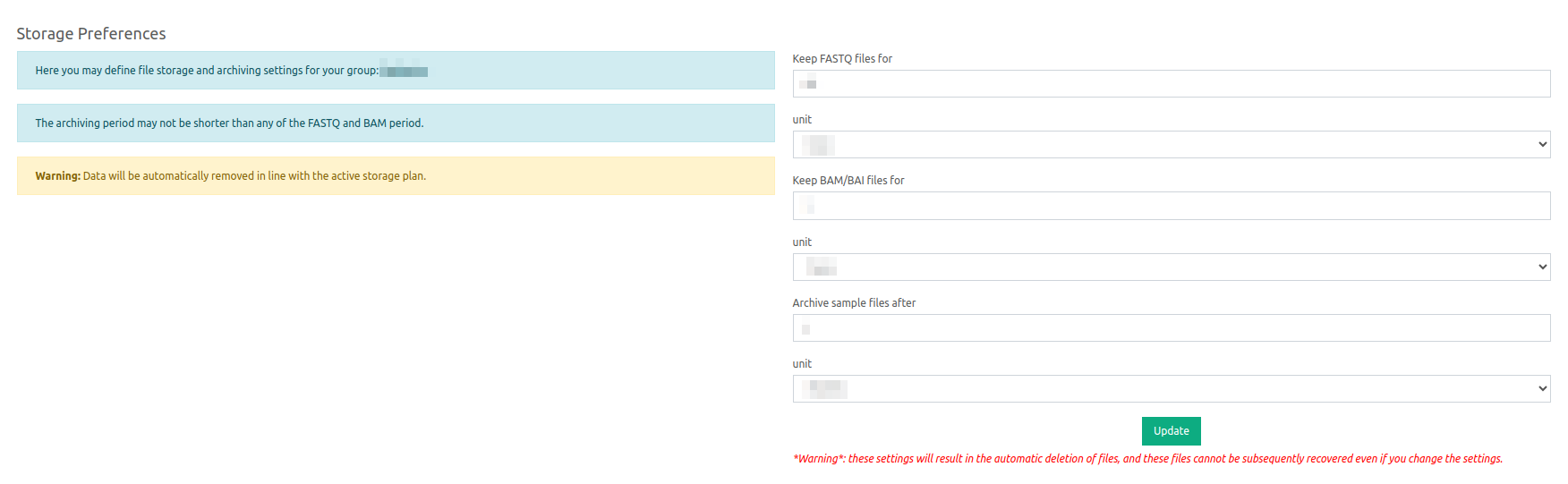 - Storage preferences: modify the storage preferences of the group and decide how long to store FASTQ or BAM files for example. Find more information here.